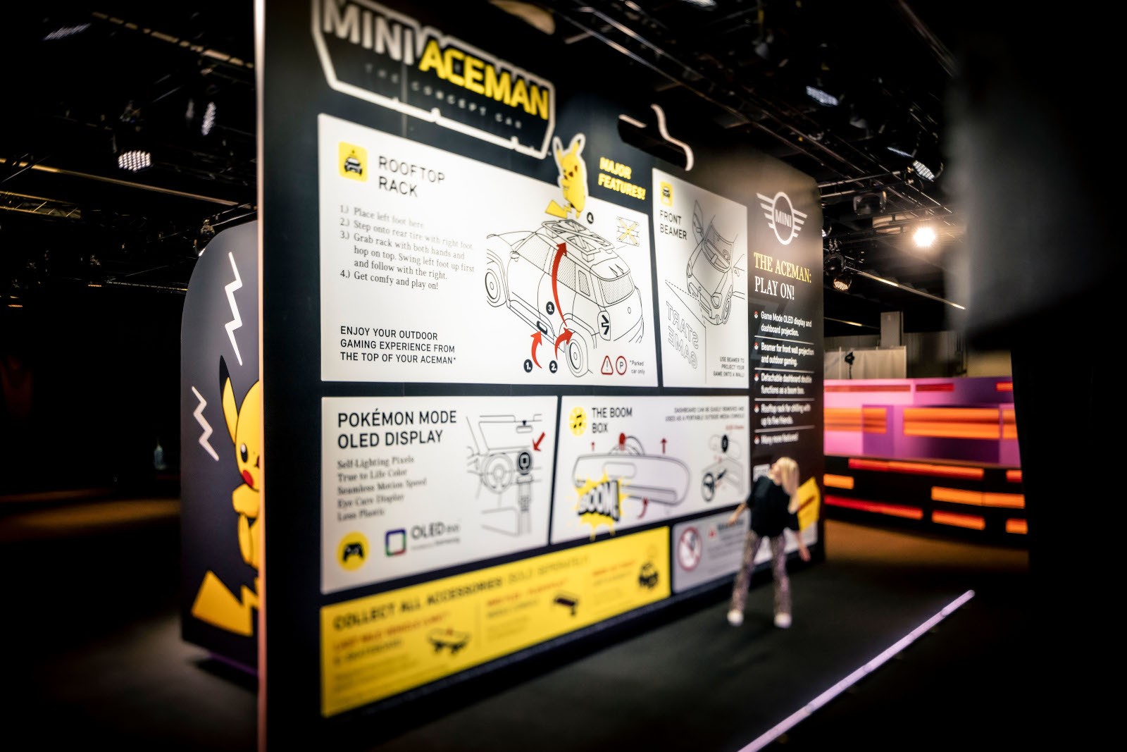 Los visitantes del área de merchandising de Gamescom "Powered by MINI" podrán descubrir el MINI Concept Aceman con modo Pokémon. Durante Gamescom 2022, Pikachu, el personaje icónico de Pokémon, se hace cargo de la pantalla OLED como el nuevo instrumento central al operar el modo de experiencia. A través de la tecnología de proyección avanzada, la animación también se extiende por el tablero, las puertas delanteras y la proyección del delantal. En el ciclo animado, la Poké Ball aparece primero en movimiento en la pantalla OLED, luego se abre en un brillo azul que se mueve de manera impresionante desde la pantalla OLED a través del tablero y la barra de luces de las puertas, así como la proyección del delantal a través del interior del vehículo. En otra animación, Pikachu aparece en la pantalla al inicio. El famoso Pokémon eléctrico lanza un ataque de rayos de color amarillo brillante que también viaja a través del vehículo, sobre las puertas interiores y la proyección del delantal.