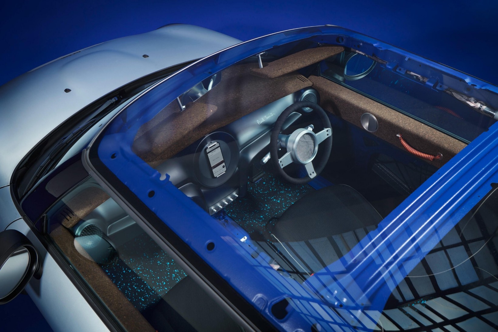 El MINI STRIP también se mantiene fiel al lema de "Simplicidad y Transparencia" en el interior, cortesía de un despojo radical. Todas las piezas de los acabados se han omitido a propósito (con la excepción del tablero de instrumentos, almohadillas de adorno y el estante para paquetes), convirtiendo la carrocería en la característica visual dominante de la cabina. Se ha coloreado de azul a petición explícita de Paul Smith, produciendo un efecto particularmente llamativo. El material básico expuesto y el tono azul intenso dan al interior un atractivo anestésico por sí solo; está desnudo pero se siente "vestido" al mismo tiempo.